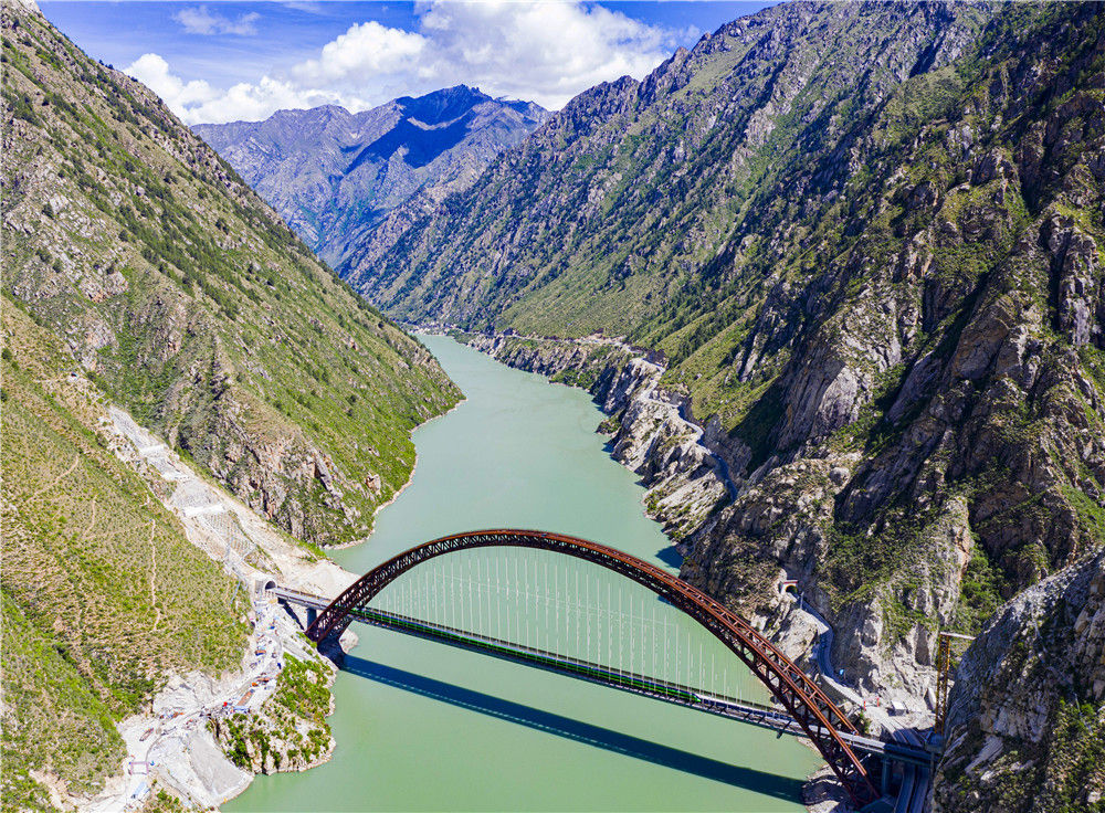6月17日,試運(yùn)行的復(fù)興號(hào)列車行駛在川藏鐵路拉林段藏木特大橋(無人機(jī)照片)。新華社記者 普布扎西 攝