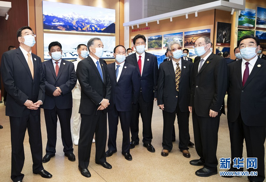 汪洋等走進展廳,一邊仔細觀看展板,一邊認真聽取講解?!妒邨l協(xié)議》簽字儀式歷史照片、實行民族區(qū)域自治制度的展板、對口援藏資金圖表、《西藏自治區(qū)民族團結(jié)進步模范區(qū)創(chuàng)建條例》圖片……一塊塊展板、一張張圖片圖表,生動展現(xiàn)了70年來西藏在黨的領(lǐng)導(dǎo)下取得的長足發(fā)展。汪洋不時駐足觀看,詳細詢問有關(guān)情況,對西藏近年來各項事業(yè)取得的成就予以充分肯定。