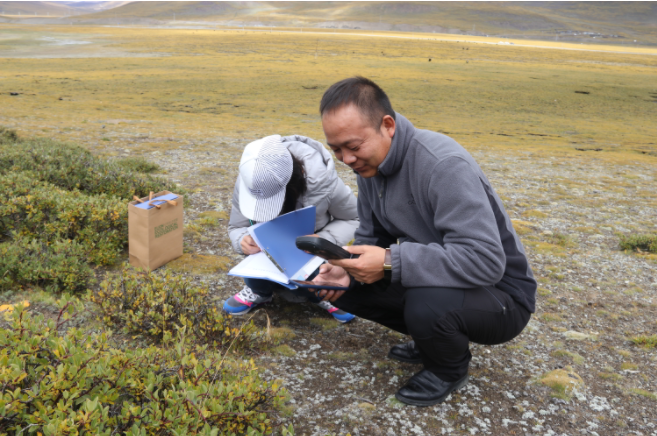 郝偉(右)和團隊工作人員在野外采集植物樣本數(shù)據(jù)。受訪者供圖