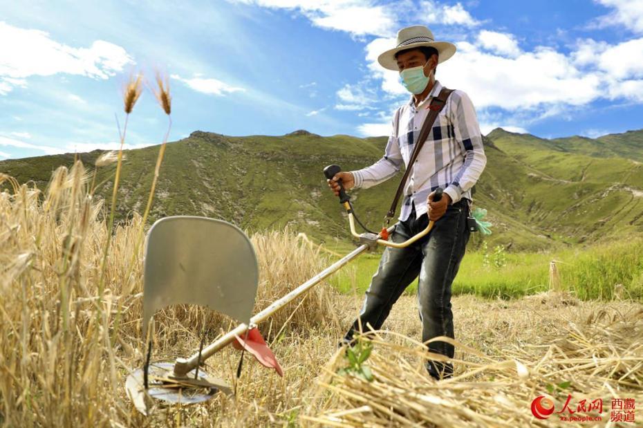 村民手持機(jī)械收割青稞。人民網(wǎng) 次仁羅布攝