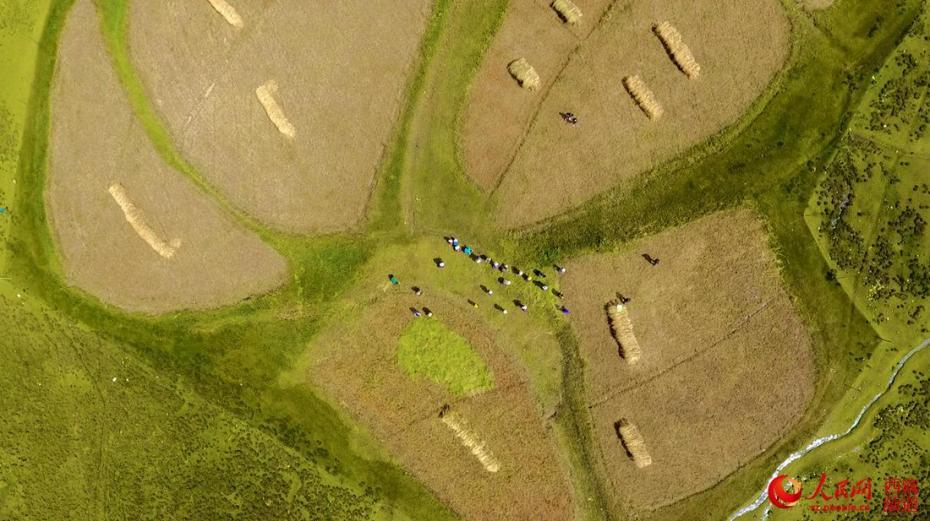 九月的西藏,已進(jìn)入青稞成熟收割時(shí)節(jié)。記者來到拉薩市曲水縣熱堆村,成片成片成熟了的青稞,金黃耀眼。村民們抓緊天氣晴好的時(shí)機(jī),互幫互助忙收割,確保顆粒歸倉。地頭田間,有的已被割倒束成捆,也有的仍在迎風(fēng)搖曳,等待收割,村民們揮舞著鐮刀,將成熟的青稞收割、扎捆、然后堆砌成一排排整齊的青稞垛子,用拖拉機(jī)將青稞運(yùn)回家,再上架晾曬,看著沉甸甸的麥穗,聞著空氣中彌漫著沁人心脾的青稞香,村民們臉上露出了喜悅的微笑。無人機(jī)鳥瞰青稞田地。人民網(wǎng) 次仁羅布攝