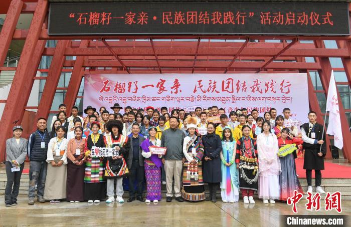 圖為學生們在第五屆西藏青少年民族團結教育實踐營活動啟動儀式上合影留念?!∝暩聛硭?攝