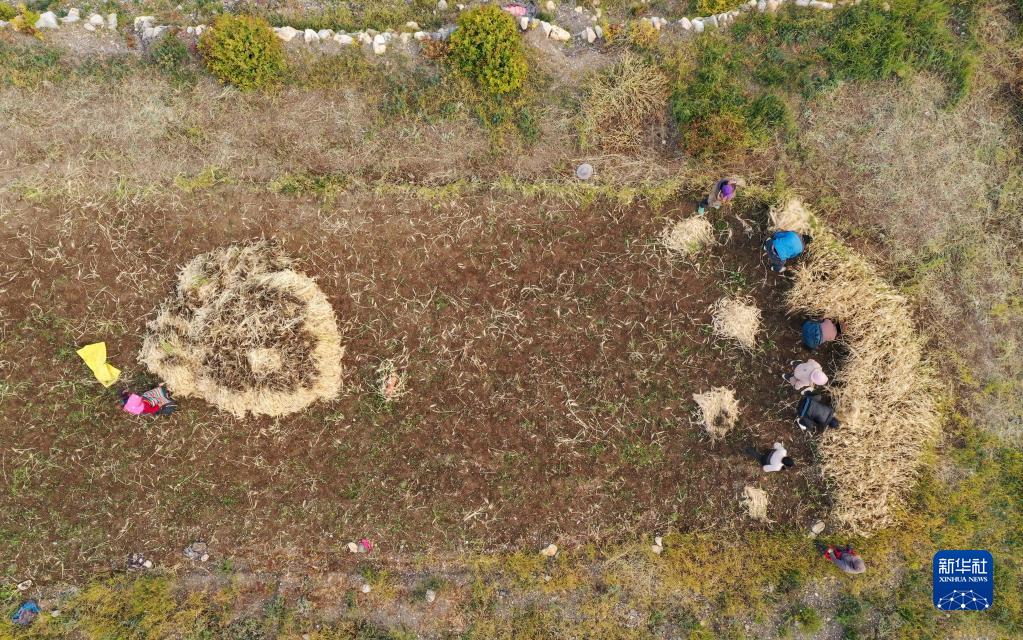 9月23日清晨,西藏那曲市尼瑪縣文部鄉(xiāng)文部南村村民開鐮收割(無(wú)人機(jī)照片)。新華社記者 晉美多吉 攝