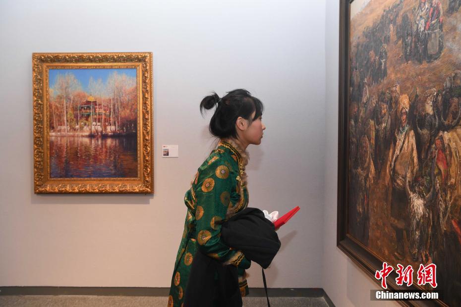 9月26日,“第四屆雪域情西藏油畫展”在西藏自治區(qū)自然科學博物館舉辦。此次油畫展共展出入選作品80余幅,展期為10天。圖為一名參觀者在觀看作品。 中新社記者 貢嘎來松 攝