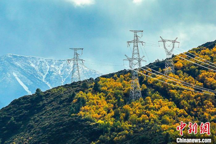 圖為雪山、秋色與藏中電力聯(lián)網(wǎng)工程的電塔。國網(wǎng)西藏電力有限公司 供圖