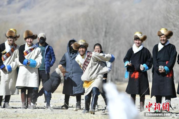 資料圖為西藏拉薩市曲水縣民眾新年期間表演藏族民間娛樂項目“打牛角”。中新社記者 貢嘎來松 攝