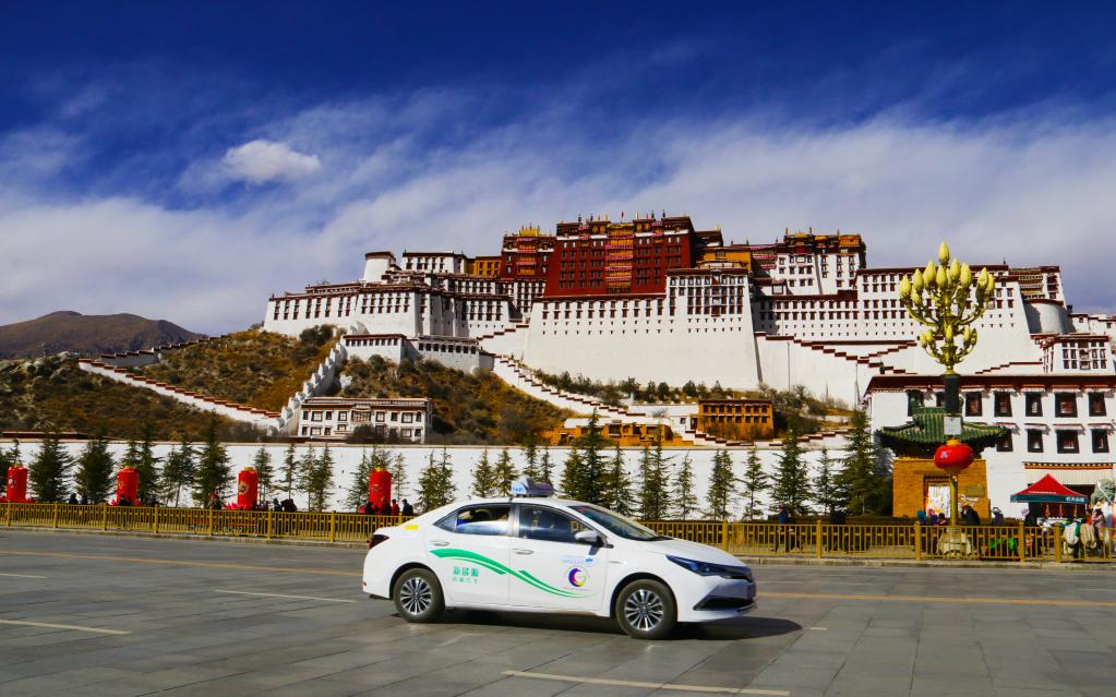 新能源出租車從布達(dá)拉宮廣場前駛過(2018年2月11日攝)。 新華社發(fā) 央梅朵 攝
