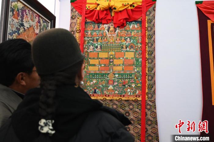 圖為唐卡愛好者欣賞唐卡展品。趙朗 攝