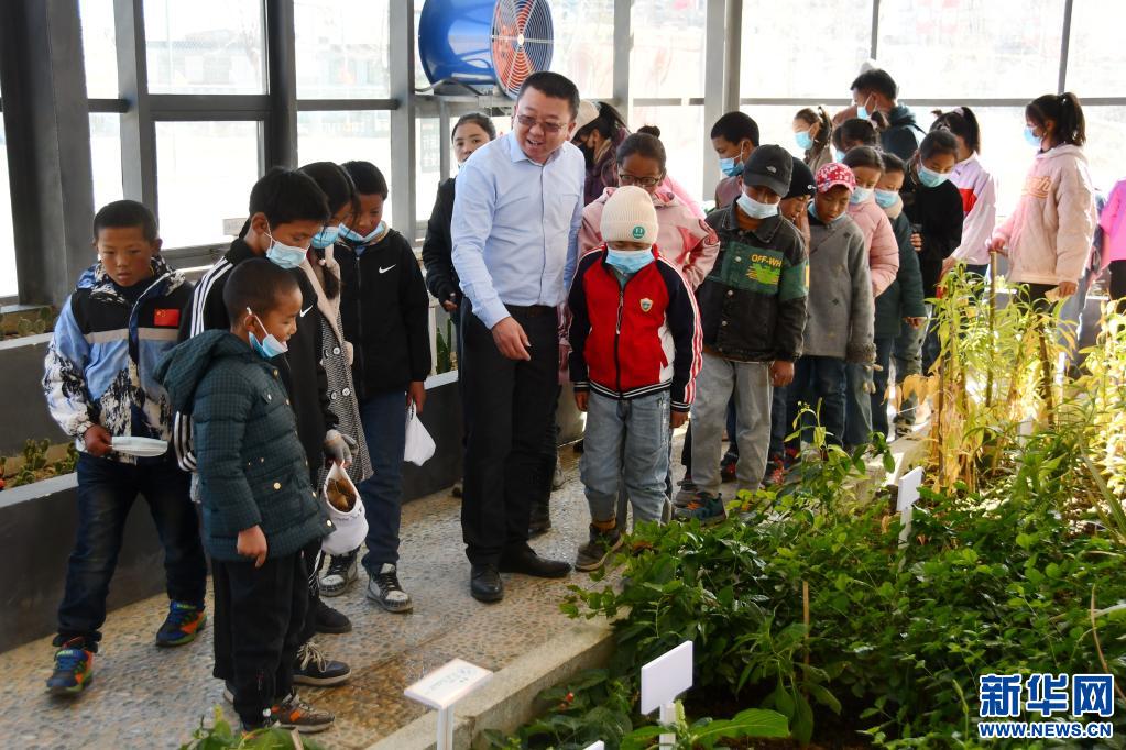 勞動(dòng)教育課上,援藏教師潘杰和藏族學(xué)生在一起(2021年9月14日攝)。