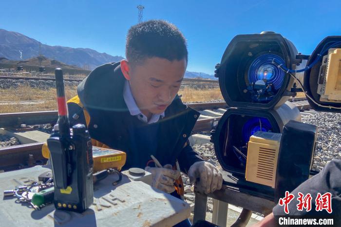 圖為劉興文在拉日鐵路測試信號(hào)機(jī)電燈電壓?!⊥鮼睚垺z