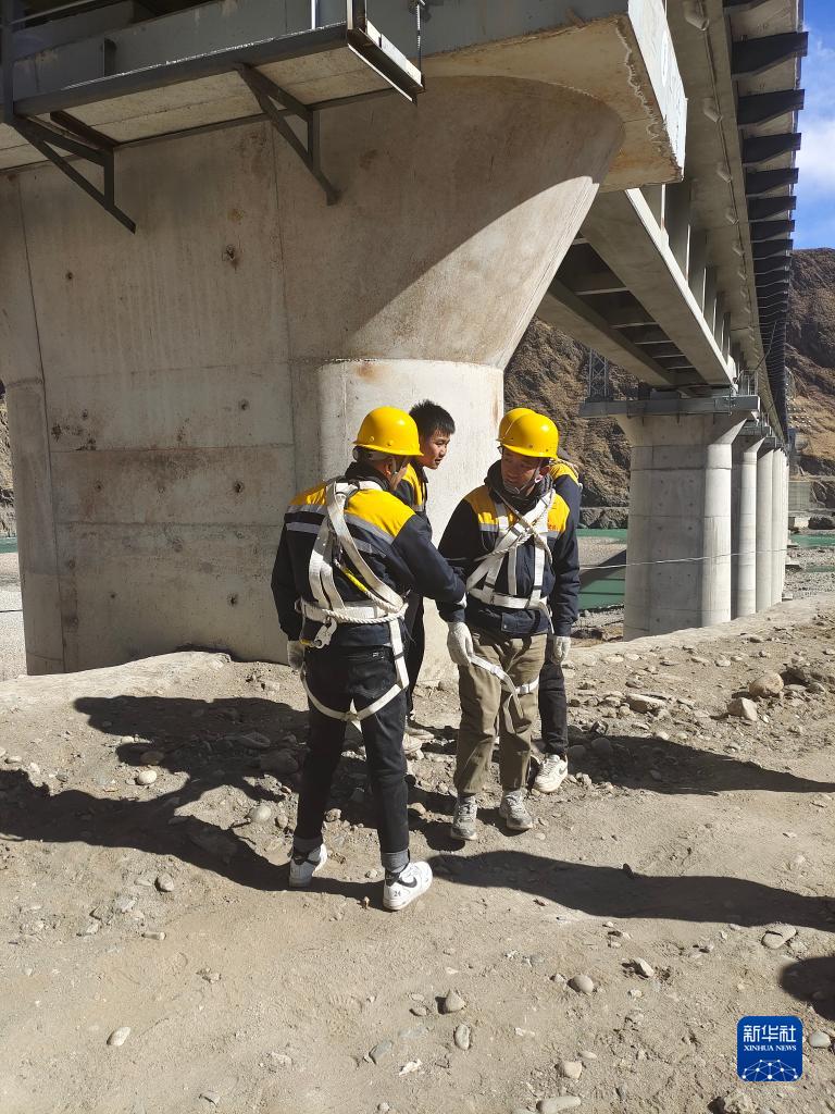 冷達(dá)2號(hào)雅魯藏布江特大橋橫跨雅魯藏布江?!?0后”橋隧工趙浩澤穿著亮黃色安全馬甲,系好安全帶,開(kāi)始檢查抗震樁、支座和支撐墊石的情況。