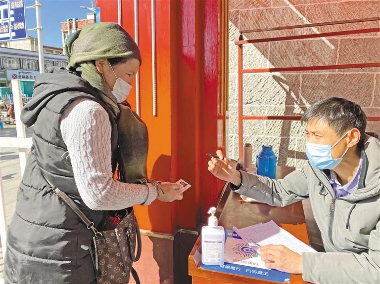 八廓商城市場部部長卓嘎介紹說:“為廣大市民提供一個安全、祥和的購物環(huán)境,我們在商場設有5個進出口,每個進出口都需掃行程碼、測量體溫后才可進入。因為有些老人沒有智能手機,無法掃健康瑪,我們會登記姓名、身份證號、聯(lián)系方式。并且在增加的攤位旁增設消防器材,不定時巡邏?!?/p>