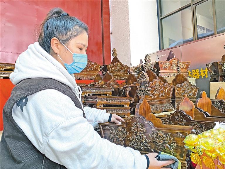 來自山南市貢嘎縣的拉吉帶著自家生產(chǎn)的“切瑪盒”第2次來到八廓商城年貨市場。“由于是自家生產(chǎn),所以我們自主設計了一款線條稍微簡約的‘切瑪盒’;還有一款傳統(tǒng)線條與圖案的‘切瑪盒’。在顏色上,我們選擇了較為持重的深色,這樣的顏色大氣沉穩(wěn),許多市民非常喜歡,兩款售價都是380元?!崩榻B道。