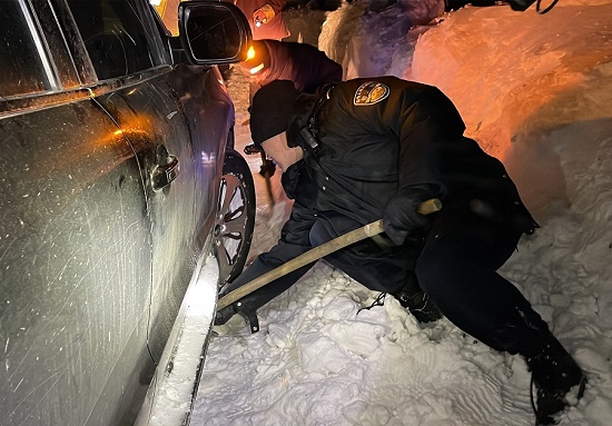 在到達(dá)現(xiàn)場后,救援民警立即為早已凍得瑟瑟發(fā)抖的被困人員送上了熱水和防寒大衣,并安撫了被困人員情緒。在勘察了現(xiàn)場的情況后,救援民警一邊用鐵鍬和雙手迅速清理車輛底盤的厚冰,一邊用牽引繩嘗試將被困車輛進(jìn)行拉出,因積雪太厚嘗試多次未能成功,隨后,協(xié)調(diào)到朗縣養(yǎng)護(hù)段一輛推土機(jī),經(jīng)過一個小時(shí)救援,被困車輛成功被拖出。被困人員救出來后,為了確保車輛人員的絕對安全,金東邊境派出所救援民警全力護(hù)送被困人員于晚上11點(diǎn)45分安全抵達(dá)單位營區(qū),救援工作取得圓滿成功。