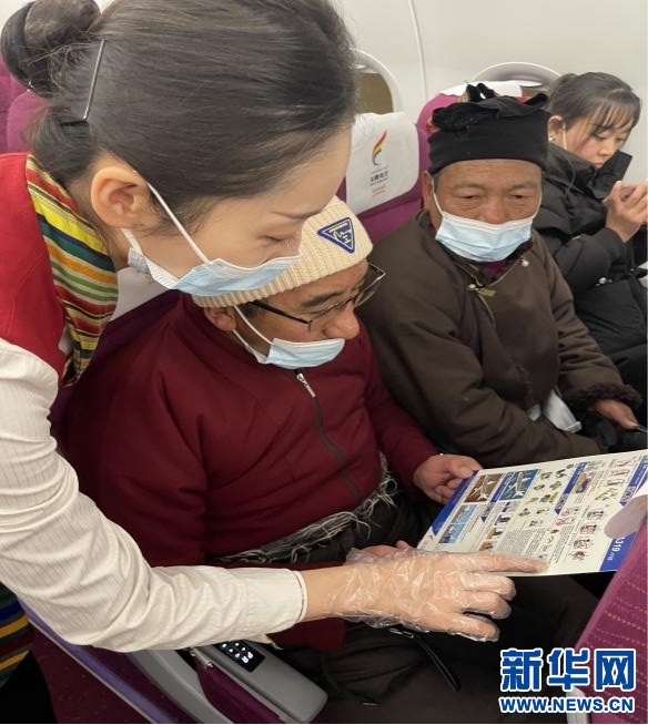 圖為客艙乘務(wù)員為藏族首乘旅客介紹帶有藏語(yǔ)的安全須知卡。(受訪者提供)
