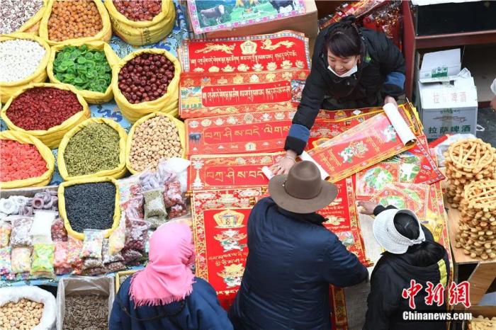 2021年2月,西藏拉薩,藏歷新年來臨之際,民眾選購(gòu)藏式春聯(lián)。中新社記者 貢嘎來松 攝