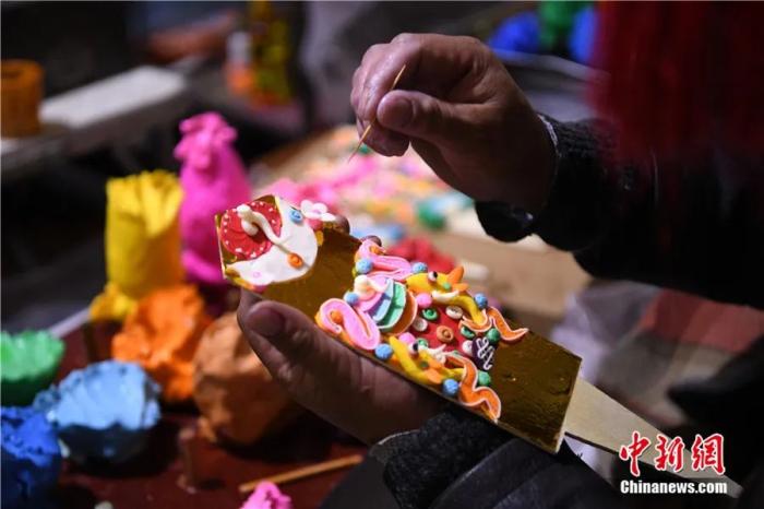 2022年2月14日,酥油花手工藝人在拉薩八廓古城現(xiàn)場(chǎng)制作。藏歷新年臨近,酥油花在年貨市場(chǎng)熱銷。酥油花在藏語中稱為“孜扎”,是古時(shí)藏傳佛教信眾因冬季沒有鮮花供佛而發(fā)明的替代品,如今已是藏族老百姓家庭中必備的年貨之一。中新社記者 貢嘎來松 攝