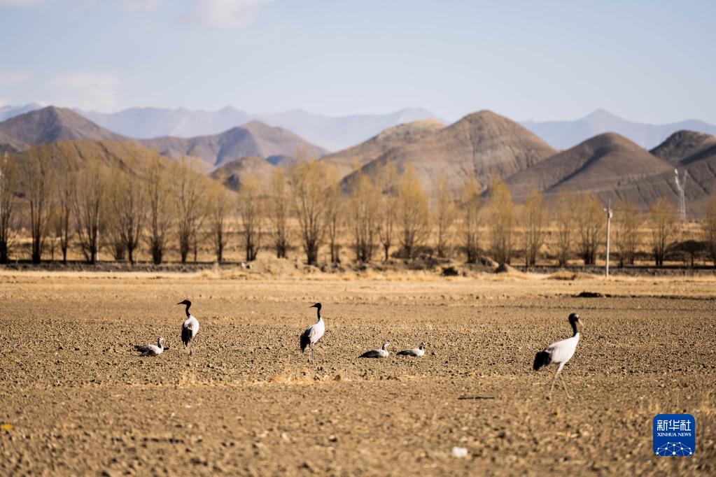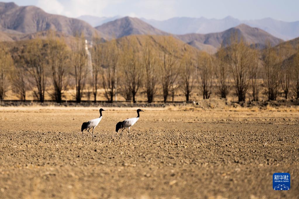 這是在西藏日喀則市桑珠孜區(qū)的農田里拍攝的黑頸鶴(3月12日攝)。新華社記者 周荻瀟 攝