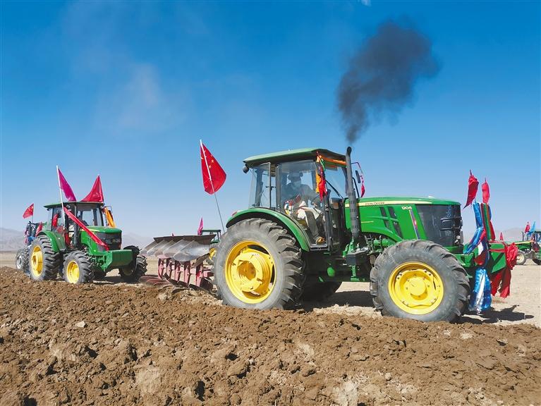 在桑珠孜區(qū)曲美鄉(xiāng)拉貴村春耕儀式上,村民用大型農(nóng)用機(jī)械開耕犁地。記者 扎西頓珠 攝