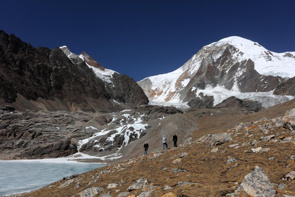 2022年3月27日,幾位探險者在遠(yuǎn)眺窮母崗日峰腳下的冰川。(新華社記者 姜帆 攝)