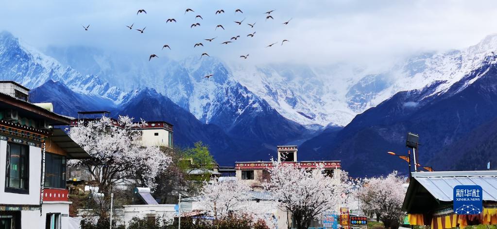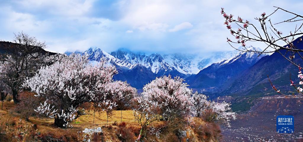 雅魯藏布江河谷一路桃花盛開(kāi),和雪山相映成趣。圖為米林縣索松村遠(yuǎn)眺南迦巴瓦峰。新華社記者 沈虹冰 攝