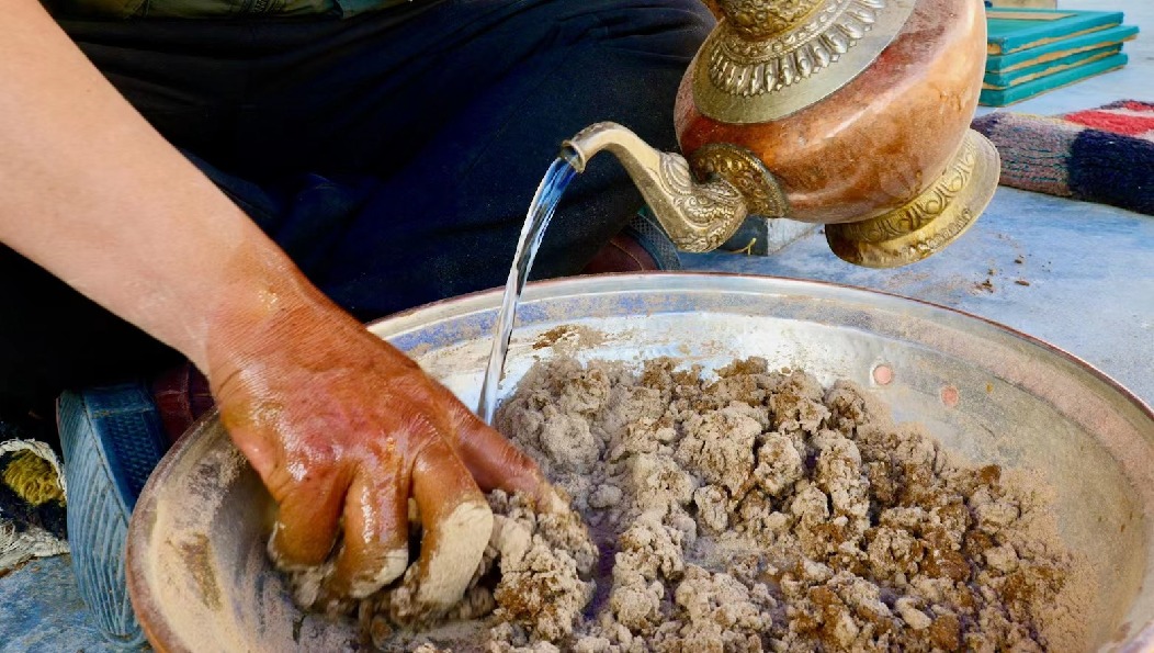 靜謐的午后,空氣里都是柏木的清香。次仁多吉盤坐在遮陽傘下,伴著周圍清脆的流水、水磨聲,輕揉著手中的香泥。隨后他用手一抓,迅速將香泥擠進(jìn)帶孔的牛角器中,身子微微前傾,手指用上巧勁,一根根藏香便排在紗網(wǎng)之上。
