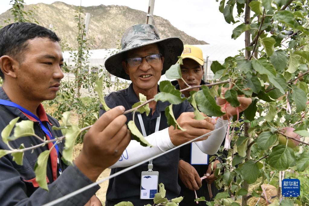 技術(shù)人員(中)在指導(dǎo)森布日村村民管理蘋果樹(資料圖)。新華社記者張汝鋒攝