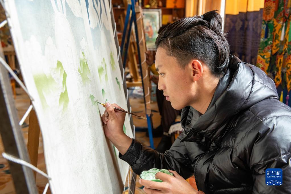 在昌都市察雅縣的產(chǎn)業(yè)車間,唐卡畫師在作畫(4月8日攝)。新華社記者 周荻瀟 攝