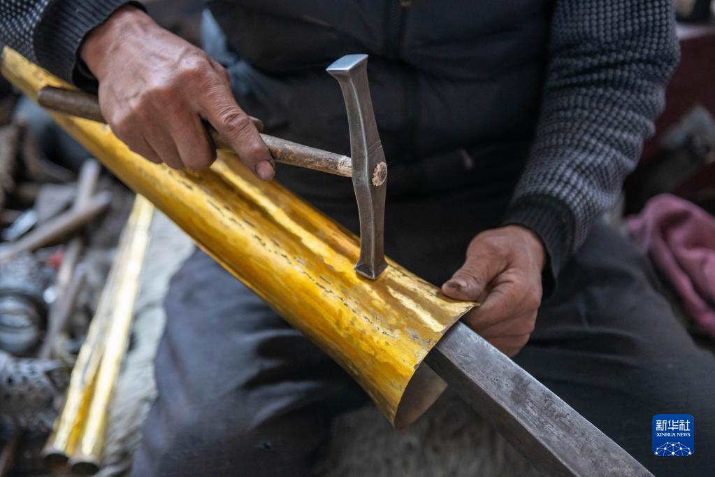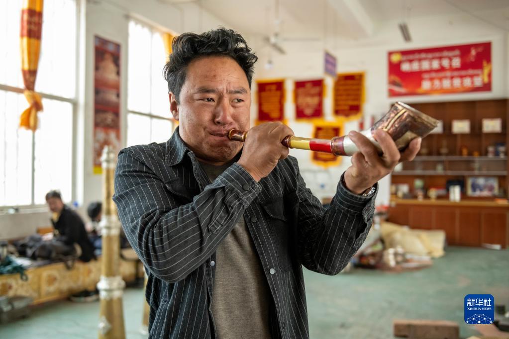 在昌都市察雅縣的產(chǎn)業(yè)車間,手工藝人吹響已加工好的樂(lè)器(4月8日攝)。新華社記者 周荻瀟 攝