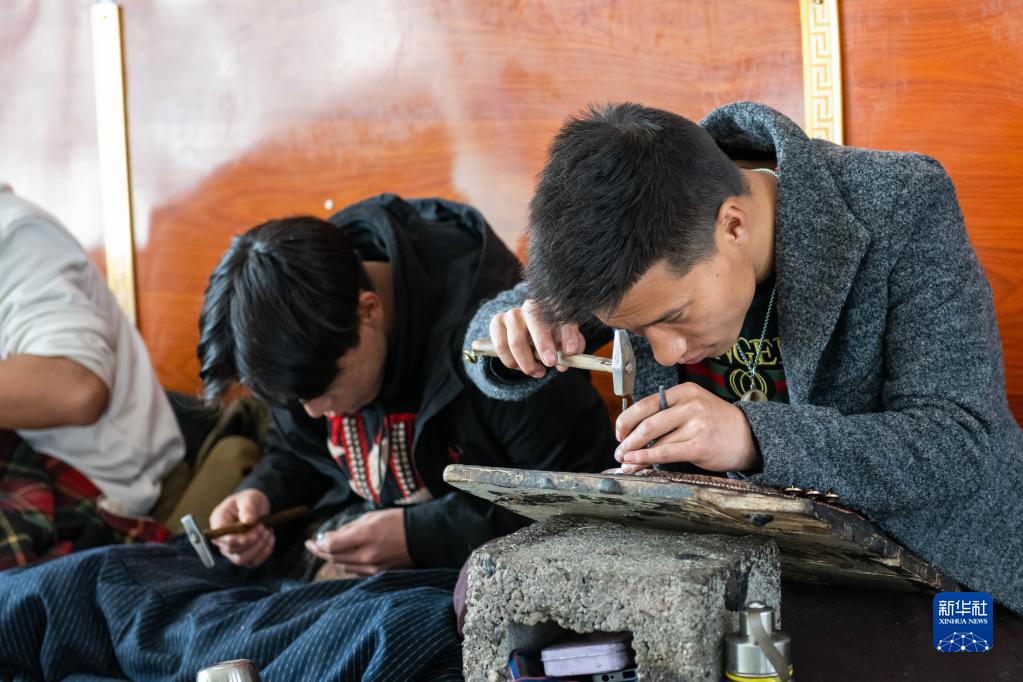 在昌都市察雅縣的產(chǎn)業(yè)車間,手工藝人在加工金銀器(4月8日攝)。新華社記者 周荻瀟 攝