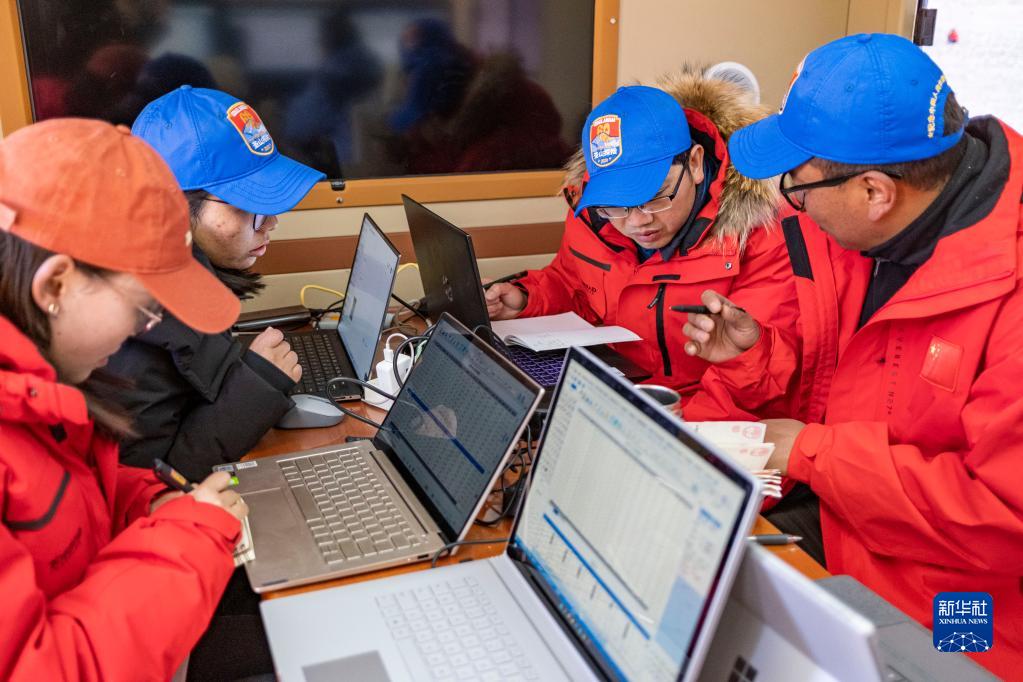 在珠峰登山大本營的氣象應(yīng)急保障車內(nèi),西藏自治區(qū)氣象局工作人員在查看實時氣象數(shù)據(jù)(5月3日攝)。新華社記者 孫非 攝