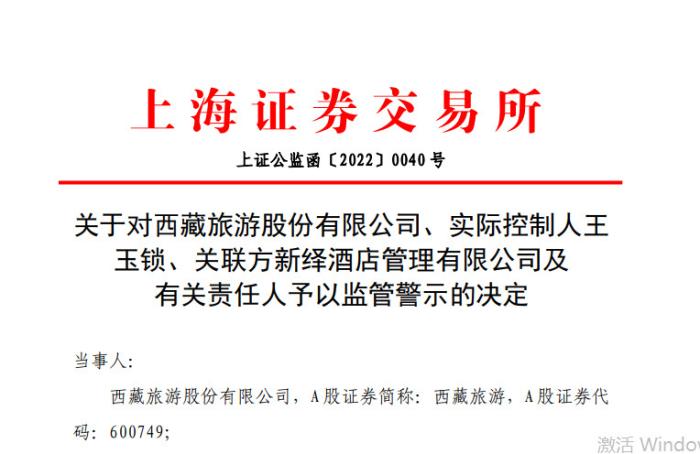 據(jù)上交所7日消息,因涉及非經(jīng)營(yíng)性資金占用,且相關(guān)信息披露不真實(shí)、不準(zhǔn)確等,上交所決定對(duì)西藏旅游股份有限公司、實(shí)際控制人王玉鎖、關(guān)聯(lián)方新繹酒店管理有限公司及有關(guān)責(zé)任人予以監(jiān)管警示。