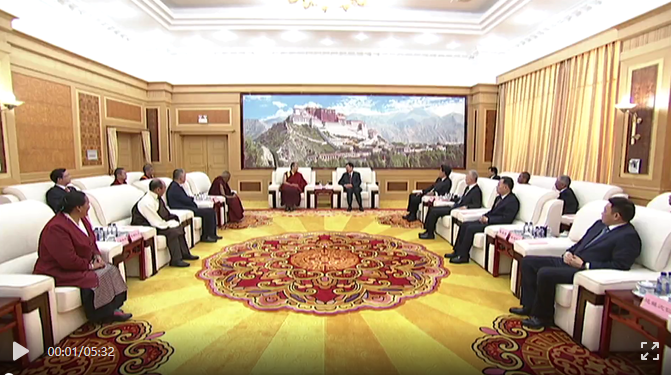 近日,西藏自治區(qū)黨委書記王君正在拉薩會見班禪額爾德尼·確吉杰布。 自治區(qū)領導洛桑江村、莊嚴、陳永奇、嘎瑪澤登、達娃次仁、甲熱·洛桑旦增、珠康·土登克珠、薩龍·平拉、索朗仁增一同會見。