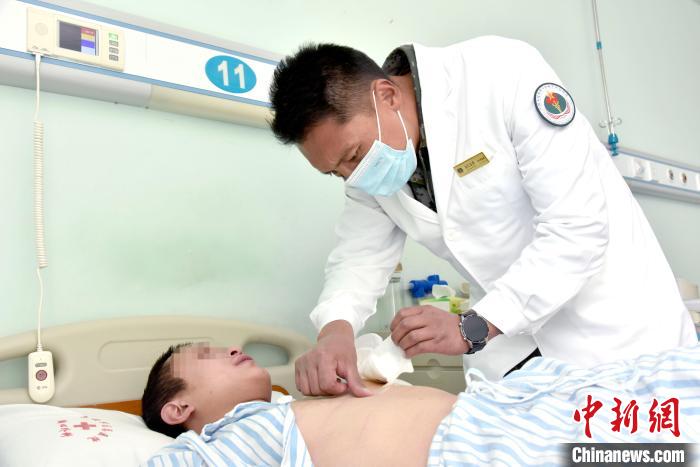 圖為西藏軍區(qū)總醫(yī)院胸科主任副主任醫(yī)師次仁云丹檢查患者小孔傷口恢復(fù)情況。李林 攝