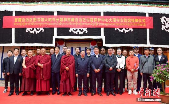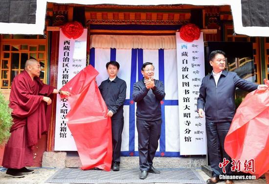 5月26日,西藏自治區(qū)圖書館大昭寺分館和自治區(qū)古籍保護中心大昭寺古籍館正式揭牌。這是繼拉薩哲蚌寺之后,又一座寺廟建立分館。圖為揭牌儀式現(xiàn)場。 中新社記者 貢嘎來松 攝