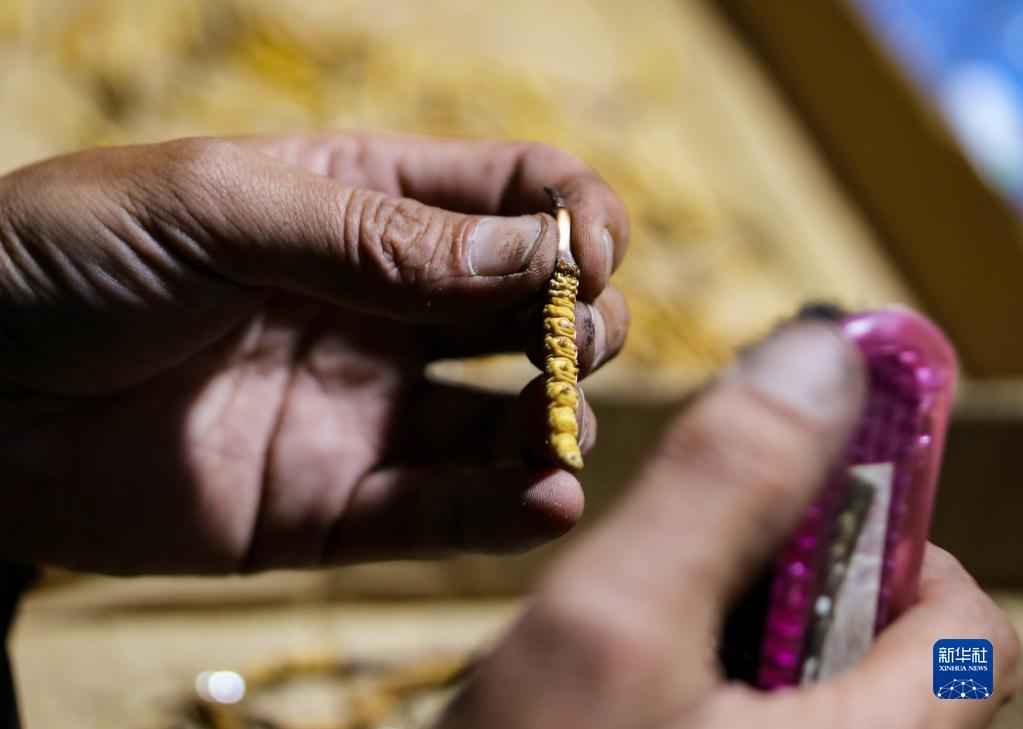 牧民其美嘎德展示剛采集到的蟲草(5月25日攝)。新華社記者 劉潁 攝