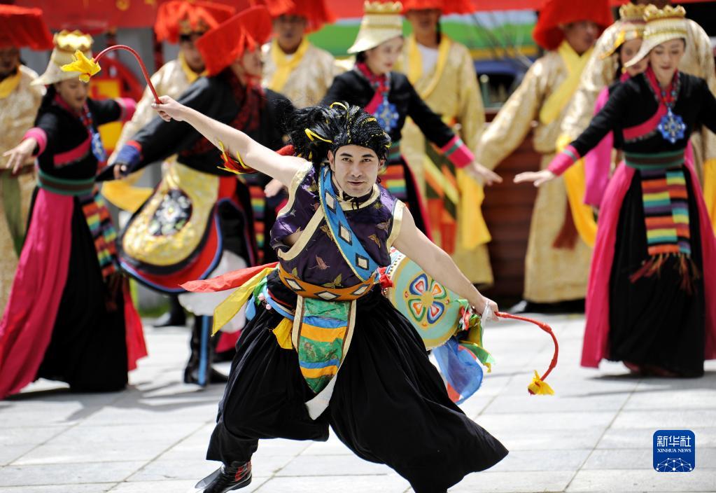 5月31日,演員在隆子縣玉麥鄉(xiāng)文化廣場表演歌舞劇《天邊格?;ā?。新華社記者 張汝鋒 攝