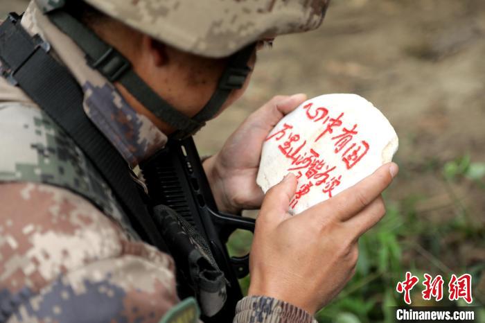 圖為官兵在邊防線上留下戍邊石。馬軍 攝