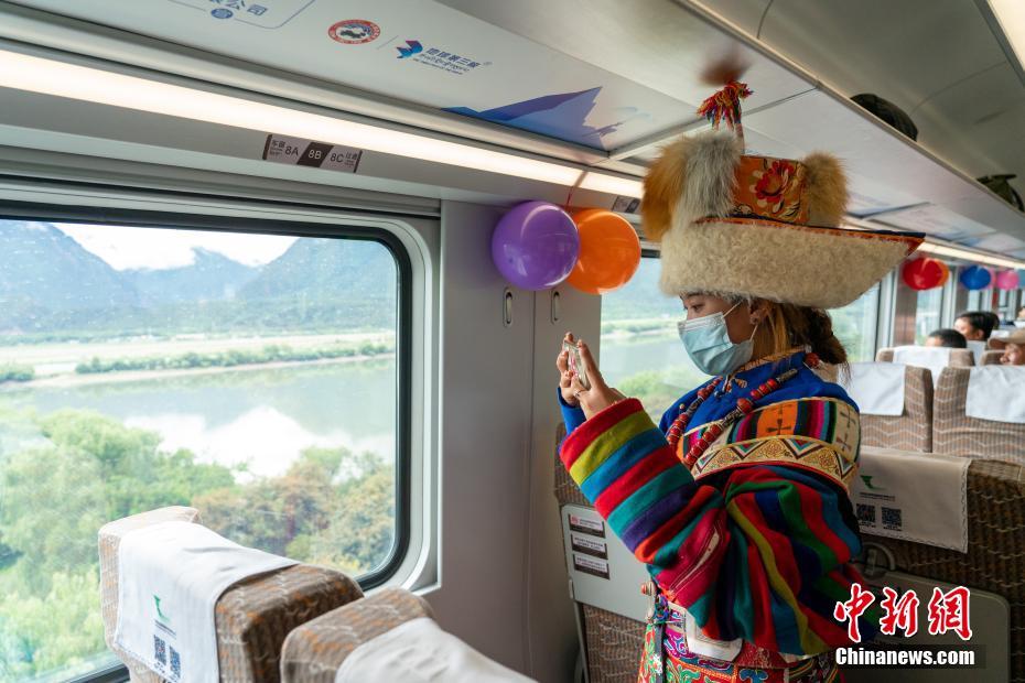 圖為當日,西藏拉林鐵路通車一周年活動上,那曲安多牧民德吉次仁身著傳統盛裝首次體驗高原復興號,在進入林芝后記錄“雪域江南”風光。 中新社記者 江飛波 攝