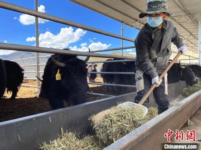 圖為拉薩市林周縣格桑塘現(xiàn)代農(nóng)牧業(yè)產(chǎn)業(yè)示范園內(nèi),工作人員為牦牛準備飼料。冉文娟 攝