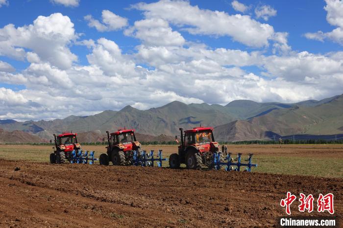 6月末的林周縣曲嘎強村,村民們正在播種燕麥飼草,機器在田間穿梭不停,一派繁忙的勞作景象。