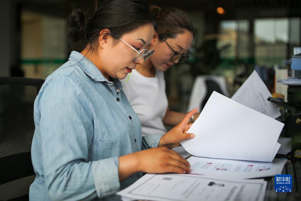 “格桑花開”大學(xué)生就業(yè)創(chuàng)業(yè)特訓(xùn)營學(xué)員、西藏藏建科技股份有限公司職員次仁瓊達(左)在工作(2022年6月24日攝)。新華社記者 姜帆 攝