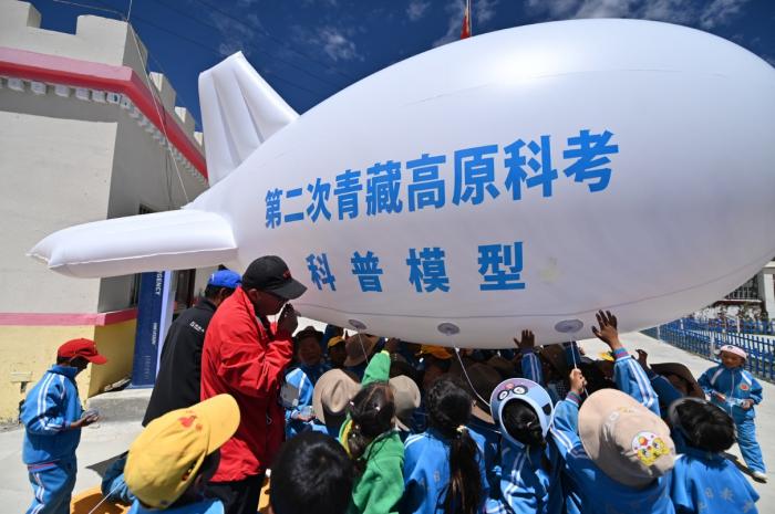 “快看,這個(gè)大白鯨飛起來(lái)啦!”,海拔4119米的西藏定日縣扎西宗鄉(xiāng)完全小學(xué)附屬幼兒園里,小朋友們看到緩緩起飛的浮空艇模型興奮地喊著。7月13日上午,中科院珠峰站觀測(cè)主管席振華用浮空艇模型、科學(xué)小實(shí)驗(yàn),在這所“珠峰之鄉(xiāng)”幼兒園的新操場(chǎng)上為孩子們上了一堂生動(dòng)有趣的戶外科普課。