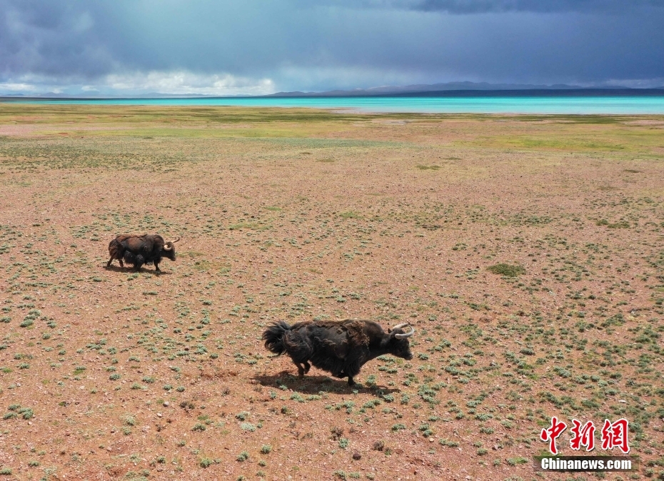 7月16日,西藏那曲羌塘草原上的野牦牛。羌塘草原位于西藏北部,是野生動(dòng)物的樂(lè)園。(無(wú)人機(jī)照片) 中新社記者 貢嘎來(lái)松 攝