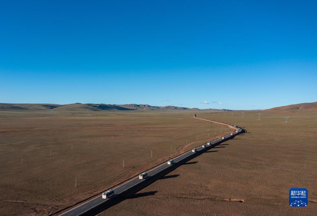 從雙湖縣出發(fā)的車隊(duì)行駛在前往森布日安置點(diǎn)的道路上(7月19日攝,無人機(jī)照片)。新華社記者 孫非 攝