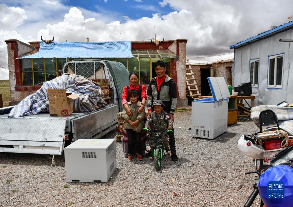 雙湖縣多瑪鄉(xiāng)果根擦曲村牧民貢覺多吉(中)和父母在老房子前合影。他們搬運的家具不多,準(zhǔn)備在新家添置新家具(7月12日攝)。新華社記者 周荻瀟 攝