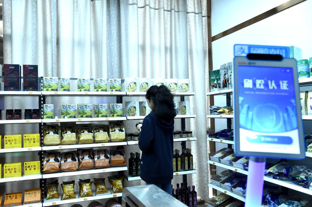 參觀者在體驗(yàn)無人超市。(新華社發(fā) 旦增努布 攝)