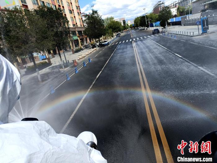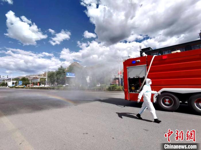 圖為拉薩消防指戰(zhàn)員在主城區(qū)街道進(jìn)行消殺?!±_市消防救援支隊(duì) 攝