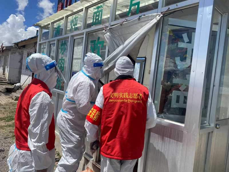 那曲市安多縣帕那鎮(zhèn)新時代文明實踐所志愿者對商鋪進行消殺。圖片由那曲市文明辦提供