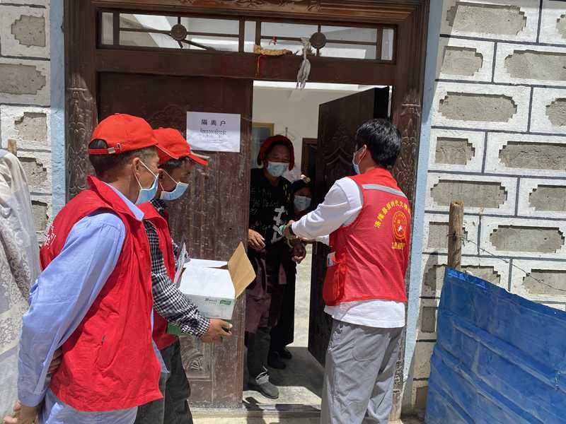 洛隆縣孜托鎮(zhèn)德康社區(qū)新時代文明實踐志愿者為社區(qū)居家隔離人員配送物資。圖片由昌都市文明辦提供